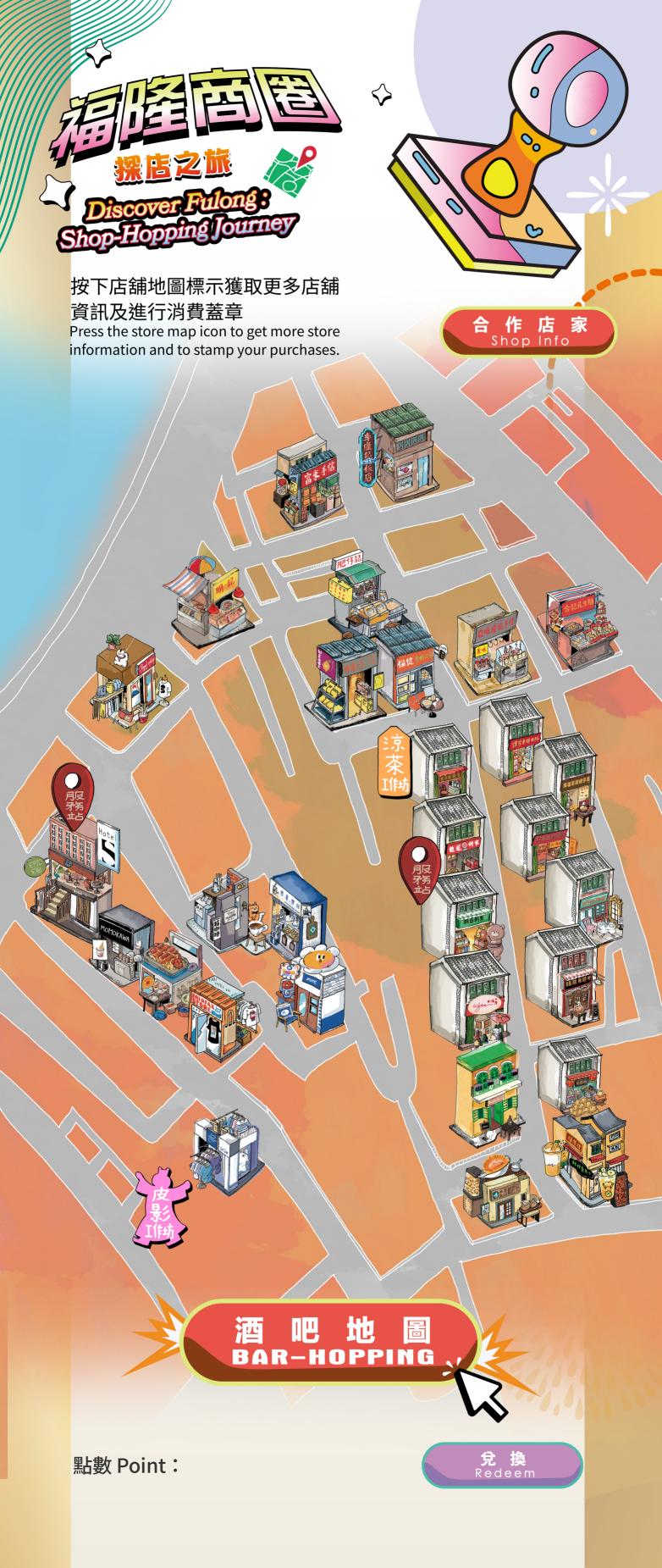 《福隆商圈探店之旅》日期為 2025 年 10 月 1 日至 8 日,地點覆蓋福隆新街及延伸一帶;合作商戶(排名不分先後)包括百家昌涼茶、福隆煌、姚標記、保健牛奶公司、翅福招牌碗仔翅、阿三靚翅飯店、壹燕堂、皮爾特小館、檸檬大王涼果店、合記花生糖、肥仔記花生糖、澳門明記牛什美食、李康記海鮮飯店、刁廚紐利、譚家魚翅鮑魚總店、福龍葡國餐、澳葡風味、鳳城權記手信、新百利來中心有限公司、富來手信、龍鳳餅家、Fairfax、Pure Zone、KAWII-MISE、more.coffee、福隆永利吧、Madz Kitchen、Momokawa、Epic 及 Folkoffee。藝術裝置方面,所有作品均設置於福隆新街,包括澳門本地藝術家 MCZ 與澳門本地紋身師 Eddie Un 的粉筆作品(位於黑板互動裝置)、香港插畫師 Angryangry 合作設計的特色商店插畫(位於互動幸運簽裝置)、澳門攝影師 WaiLeong 的視覺裝置(位於光柵動畫裝置),以及澳門本地藝術 IP「呀福」的亮相(位於一線連城有趣福字裝置)。
