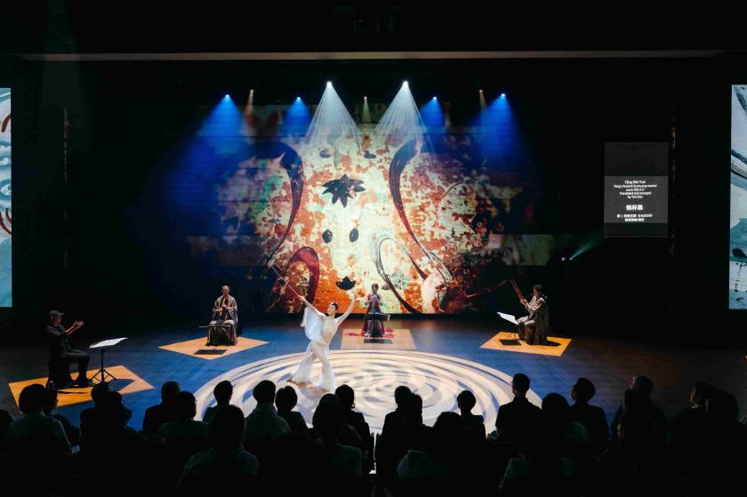《消失的藏經洞》以「活態博物館」為概念,由譚盾親自指揮,攜手敦煌古樂團演奏多首唐代古曲,包括《長沙女引》、《如意娘》、《箜篌引》等,並使用反彈葫蘆琵琶、唐笙、尺八、奚琴、篳篥、五弦琵琶、鳳首箜篌等由敦煌壁畫復原的古樂器,結合多媒體視覺與AI技術,打造身臨其境的敦煌莫高窟體驗;在這場融合歷史深度、藝術高度與匠心溫度的文化盛宴中,讓觀眾聆聽千年前藏經洞的靈魂迴響,感受超越藝術表演的文明傳承力量。