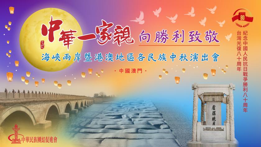 由中華民族團結促進會主辦及製作的【中華一家親‧向勝利致敬】乙巳年•海峽兩岸暨港澳地區各民族中秋演出會,於昨晚10月7日中秋追月夜晚上8時在澳門有線第三高清頻道CH3及數碼頻道60台首播,澳門日報大屏幕及APP會播放演出會精彩剪輯,而同步在中華民一家親鑄牢共同體、京獅娛樂等多個新媒體平台將進行網上直播。