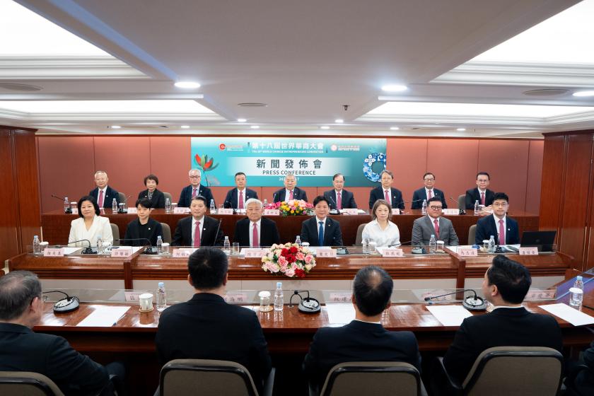 澳門中華總商會將於今年十一月二日至四日在澳門舉辦第十八屆世界華商大會,大會以「共商共築華商命運共同體」為主題,屆時將有約四千名世界華商、企業家參加會議。中總於今(17)日上午十一時在會址舉行新聞發佈會,詳細介紹大會的具體情況。出席新聞發佈會的有中總會長崔世昌,理事長馬志毅,副理事長崔煜林、余健楚、張沛然、何佩芬、徐達明、蕭志偉、莫志偉、葉兆佳、陳澤武、林燕妮、何敬麟、馬志達、許樂敏、顏奕真等。