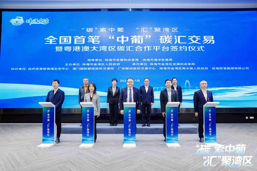 在全國首筆“中葡”碳匯交易簽約活動現場,中國—葡語國家經貿合作論壇(澳門)常設秘書處副秘書長李子蔚、自然資源部南海局一級巡視員謝健、珠海市委副秘書長穆竑等領導共同見證了首筆“中葡”碳匯正式上線。