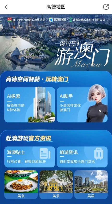 高德今年(2025年)將澳門列為“超級旅遊目的地”的首個及首選城市。旅遊局與高德藉此契機攜手推出“一鍵智慧遊澳門”,提供“吃、住、行、遊、購、娛”等一站式旅遊資訊及相關服務,打造全域旅遊智慧服務平台。