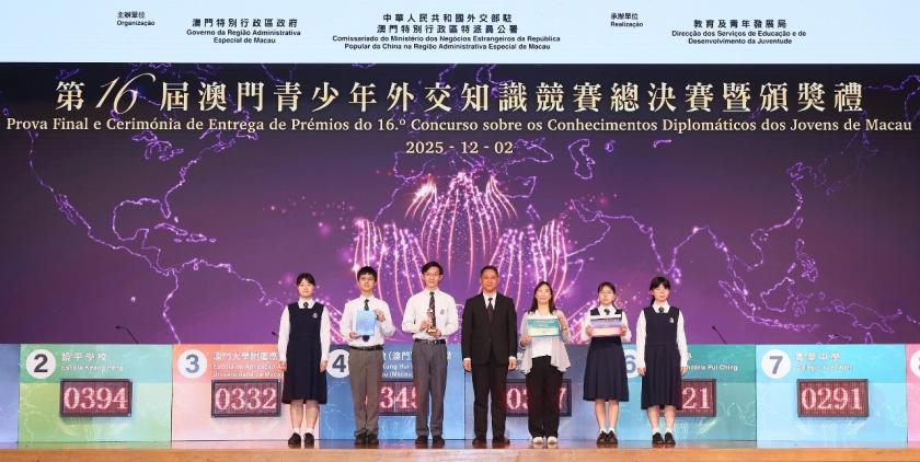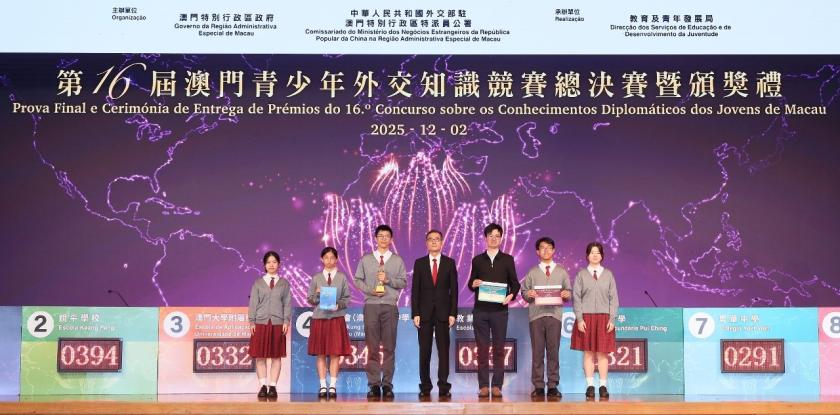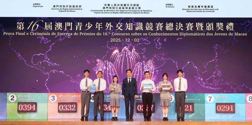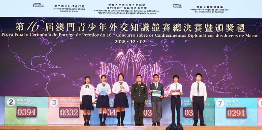 由澳門特別行政區政府與中華人民共和國外交部駐澳門特別行政區特派員公署主辦、教育及青年發展局承辦的第16屆澳門青少年外交知識競賽總決賽暨頒獎禮於12月2日舉行。競賽綜合考驗參賽學生對習近平外交思想、中國特色大國外交、涉澳外交、外交史、外交常識、時政熱點等的掌握和運用,得到特區社會各界廣泛支持。