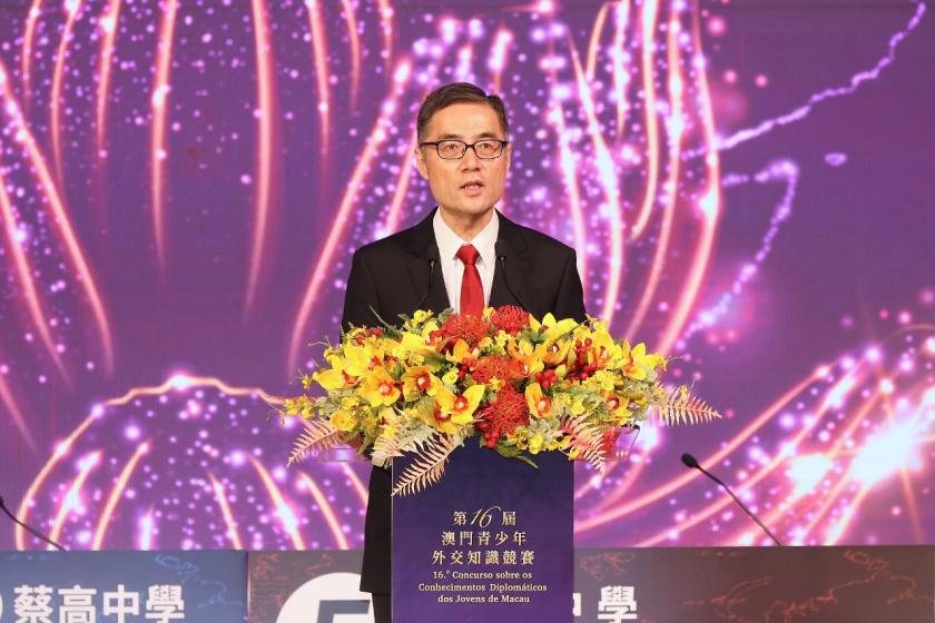 外交部發言人、外交部新聞司副司長郭嘉昆在視頻致辭中表示,澳門青少年外交知識競賽已連續舉辦了16屆,成為了一項品牌活動。習近平主席視察澳門期間強調青年是澳門的希望和未來,是建設澳門和國家的有生力量。澳門青年要心繫澳門,心繫國家,展現志存高遠腳踏實地的良好風貌。當今世界進入百年未有之大變局,十五五規劃建議擘畫了未來五年國家經濟社會發展宏偉藍圖。希望澳門青年珍惜時代機遇,樹立遠大志向,當好“一國兩制”事業的建設者和接班人,為澳門更好融入祖國發展貢獻青春和力量。