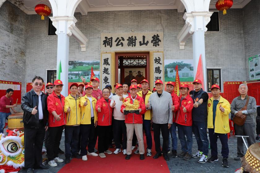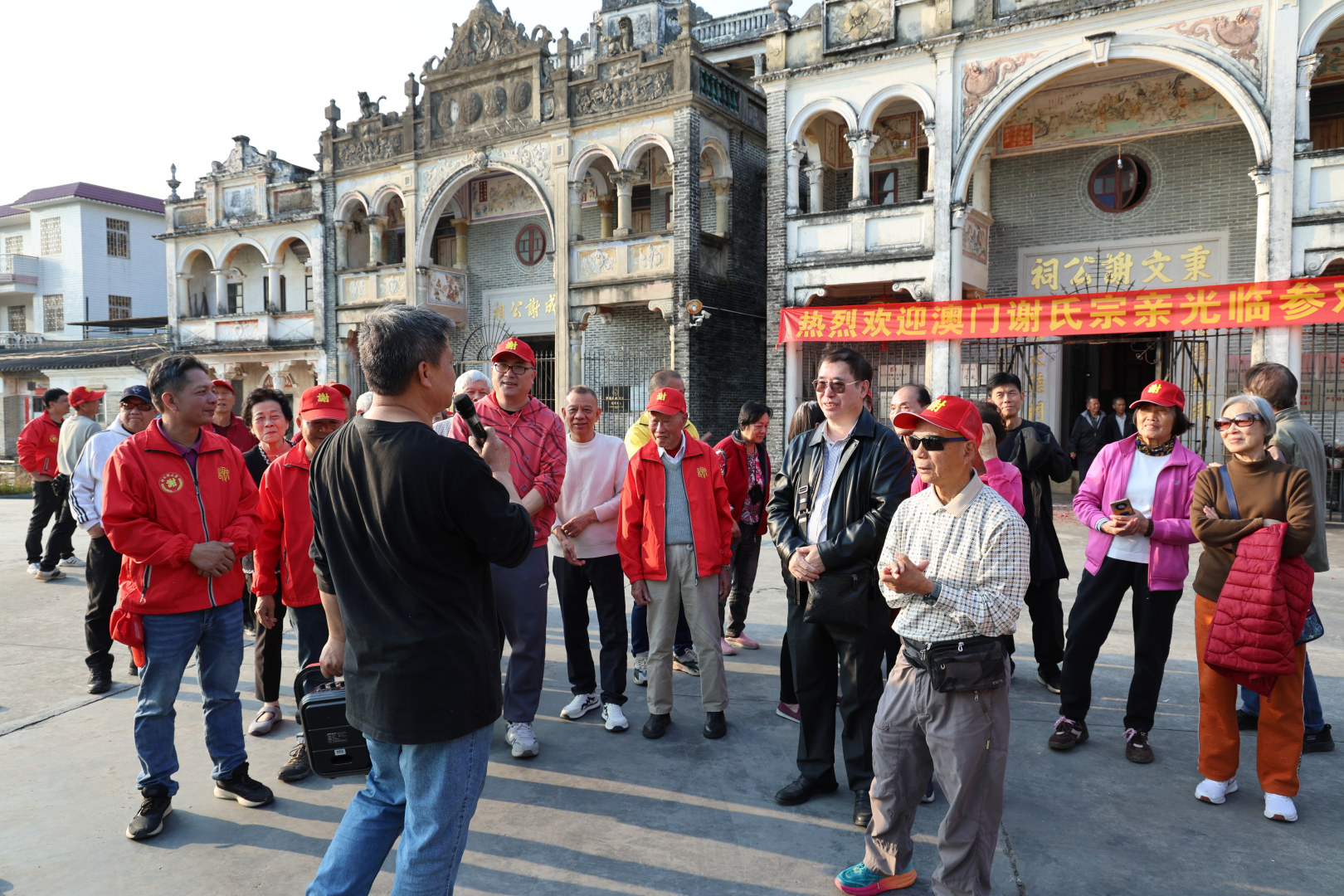 上午,首站來到蒼城夢龍謝氏宗祠。這座承載著謝氏家族數百年榮耀與記憶的建築,莊重古樸,散發著濃厚的歷史氣息。開平謝王瑾宗親熱情洋溢地為大家進行講解。他介紹道,夢龍謝氏宗祠建築風格融合了嶺南傳統特色,飛簷斗拱、雕樑畫棟,每一處細節都彰顯著先輩們的精湛技藝與智慧。宗祠內供奉著謝氏歷代祖先的牌位,莊嚴肅穆,讓人不禁心生敬畏。這裡不僅是祭祀祖先、緬懷先人的神聖場所,更是謝氏家族凝聚力的象徵,見證了家族的興衰變遷,傳承著謝氏家族的優良傳統與精神文化。通過謝王瑾的詳細介紹,宗親們對家族的歷史淵源有了更清晰的認知,深刻感受到同根同源、血濃於水的親情紐帶。