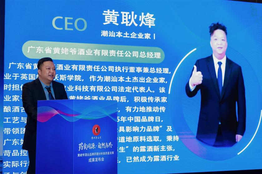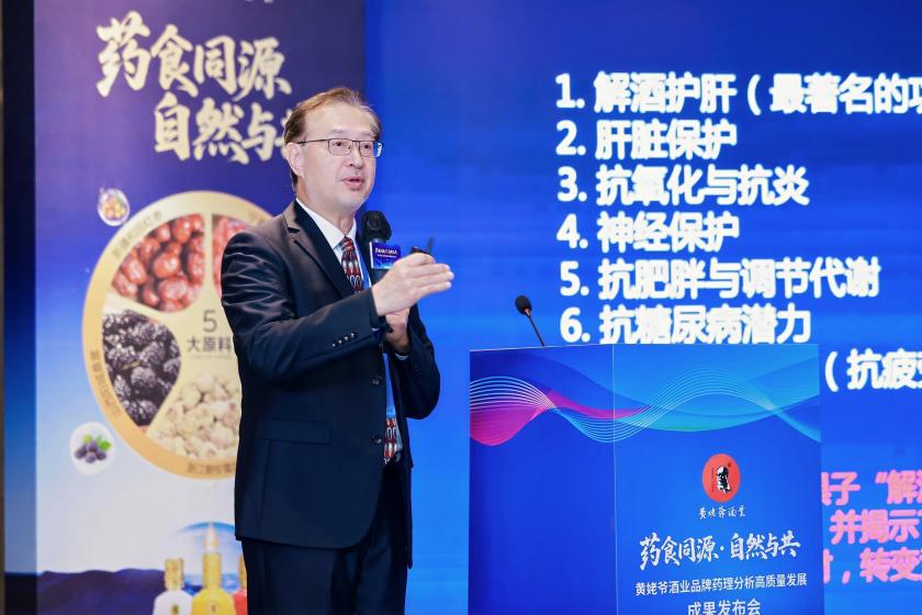 主旨發言環節中,黃姥爺酒業黃耿烽總經理立足產業前沿、深耕專業領域,帶來兼具深度洞察與實踐價值的觀點分享。他表示:藥食同源,人與自然,和諧發展,是當前最為合適的發展路徑,從“概念創新”到“標準創新”,未來品牌的新質生產力之路,應該加強以“藥食同源+現代科技”為核心,推出更多更具競爭力的產品,通過海外市場拓展成為中式養生文化的“液體名片”。黃耿烽的發言的得到現場的專家教授一致好評和認可。