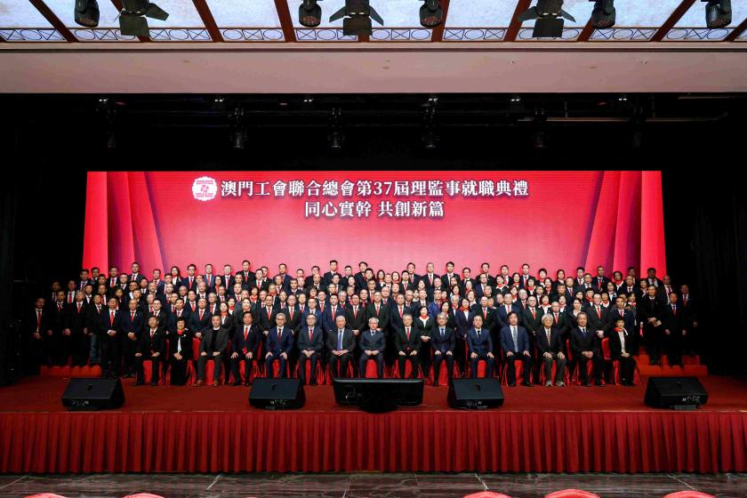 「慶祝澳門工會聯合總會成立七十六周年聯歡晚會暨第三十七屆理監事就職典禮」今天晚上(20)假漁人碼頭宴會廳隆重順利舉行,現場燈火輝煌、喜氣洋洋,處處洋溢着團結奮進的濃厚氛圍。全國政協副主席何厚鏵、行政長官岑浩輝、中聯辦副主任張應傑、外交部駐澳特派員公署署理特派員程雷、立法會主席張永春等澳門特區各界重要嘉賓應邀出席活動並擔任主禮,來自澳門各界職工代表、社會賢達及相關單位負責人等約一千五百名人士匯聚一堂,共襄盛舉。