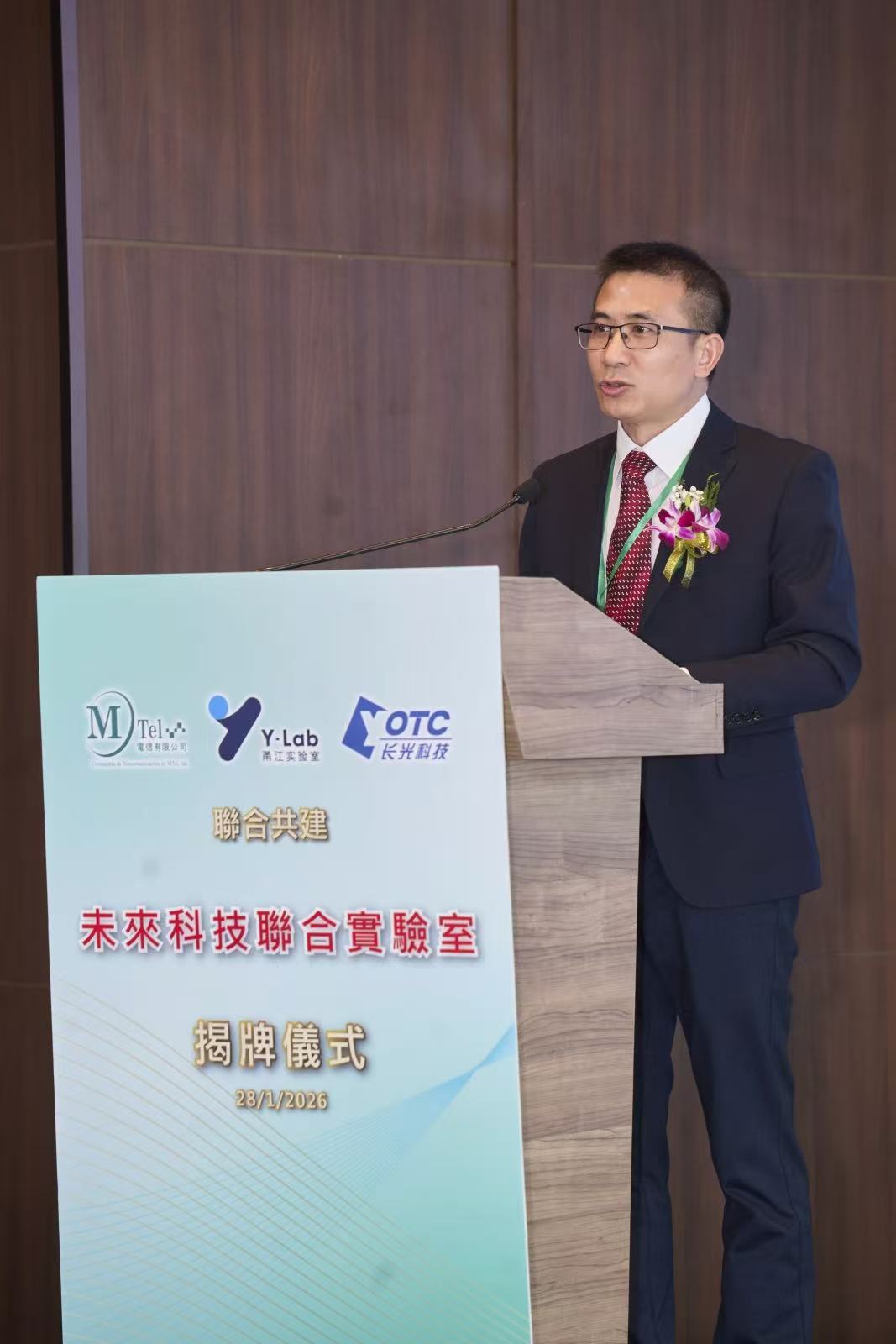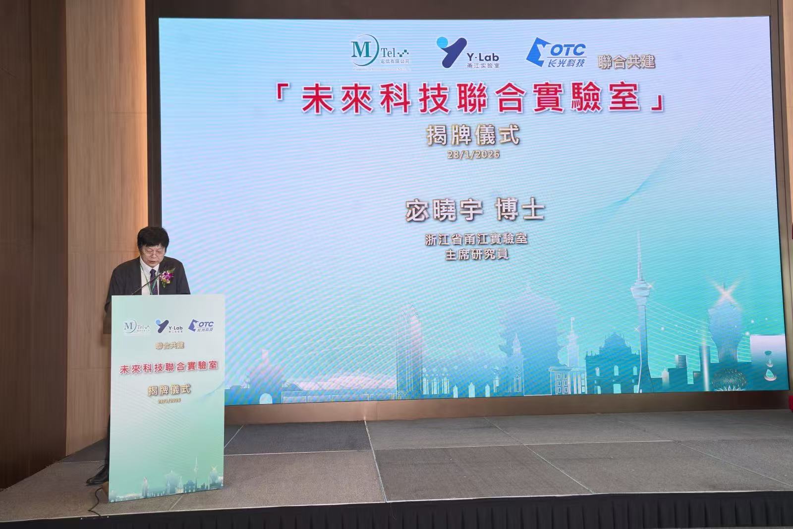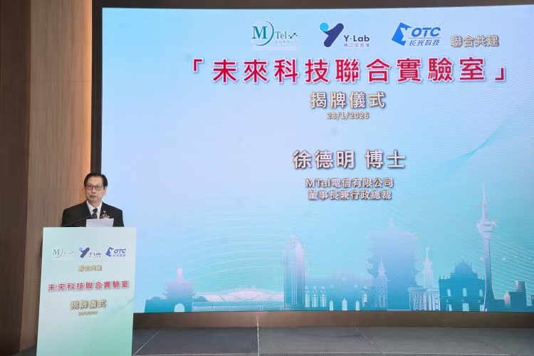 2026年1月28日上午,MTEL電信有限公司、浙江省甬江實驗室與湖北省武漢長光科技有限公司假澳門旅遊塔四樓宴會廳隆重舉行聯合共建的“未來科技聯合實驗室”揭牌儀式。MTel電信有限公司董事長兼行政總裁徐德明博士在儀式上發表致辭,強調實驗室的落地是三方協同創新的里程碑,更是回應澳門“1+4”產業適度多元化發展策略、賦能區域科創融合的務實舉措。