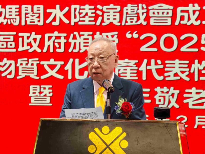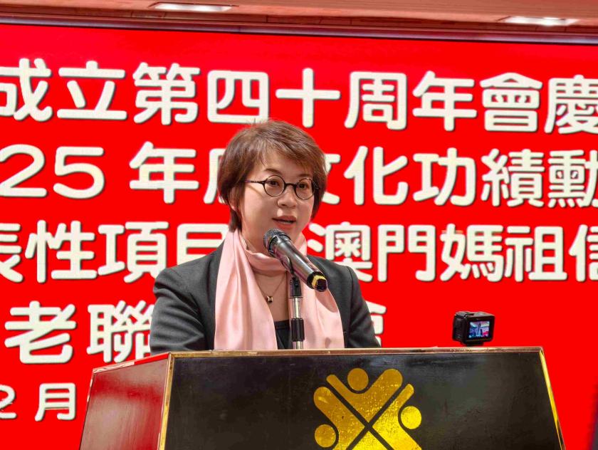 會長蔡田田在致辭中表示,澳門媽閣水陸演戲會成立四十年來,承蒙媽祖庇佑,始終深耕演戲酬神、立德行善的初心,每年農曆三月廿三的媽祖賀誕活動已成為澳門標誌性民俗盛事。她指出,此次榮獲2025年度澳門文化功績勳章,是政府與社會對該會及傳承人陳鍵銓在弘揚媽祖文化、傳承神功戲、豐富社區文化生活等方面工作的充分肯定,讓全體會友與街坊深感鼓舞。蔡田田強調,“老有所養、老有所樂”與媽祖大愛精神一脈相承,該會多年來在開展民俗展演的同時,專門設置長者專場、舉辦敬老宴,用心為長者送上關懷與歡樂,未來將繼續聯動各界力量,持續推動媽祖精神與傳統文化傳播。
