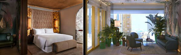 尊尚兩房式及尊尚套房由128平方米起,設有室內私人泳池、日光浴床、鋪滿馬賽克地板的綠色天河石大理石浴室,以及各種精妙手工細節。睡房以人手繪製LaLaCurio的叢林風格牆飾點綴,並延伸至如樹冠般的天花上。