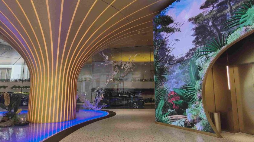 柔和的弧線、圓潤的邊緣,以及如熱帶雨林樹冠間灑落般的斑駁光影,自車道入口起便引領賓客的體驗。半戶外而低調的車道入口巧妙絲滑地將澳門躍動的城市節奏轉化為靜謐氛圍,配合周邊繁盛的綠葉營造出私密與安寧之感。光影、藝術與自然交織的生態之境,迎接賓客踏入大堂,隨即映入眼眸的便是由光與潺潺流水構築的空間,框景著象徵生命律動的「生命之樹」——大堂的核心——以流動色彩脈動生輝。