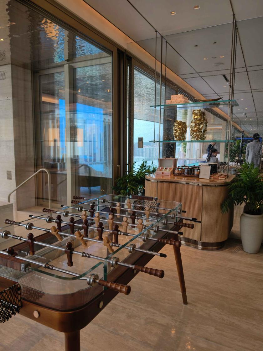 非凡體驗由一樓展開:賓客會發掘閃著淡淡鎏金的空間,層層交織著委約藝術作品。焦點包括BrunoMoinard的當代抽象水粉與油畫作品,以及美國陶藝家JasonMessinger以亞馬遜石大理石基座呈現的陶瓷「供石」雕塑。一件件作品巧妙地將柔和色調的室內基調與強而有力的藝術品融為一體。
