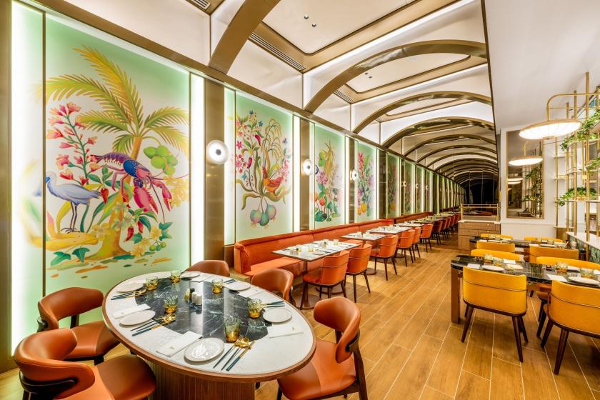 位於澳門美高梅的「話匣子」,室內設計靈感源自新加坡本店,並融入澳門獨特的葡式建築元素,透過拱形門廊、木飾細節及馬賽克嵌畫等,營造東南亞與南歐文化交融的當代氛圍。