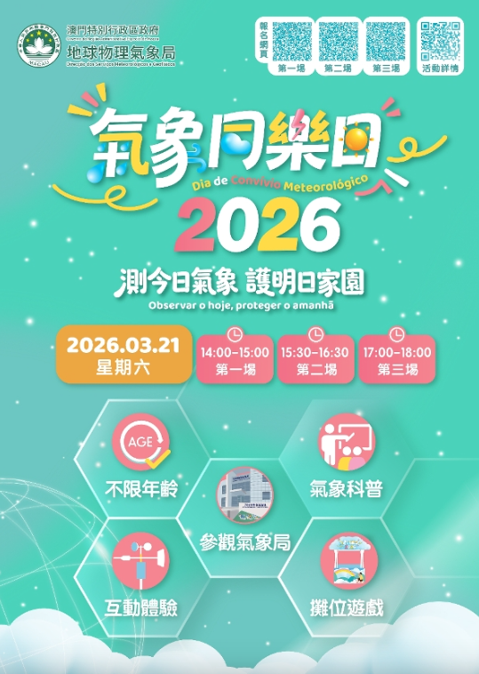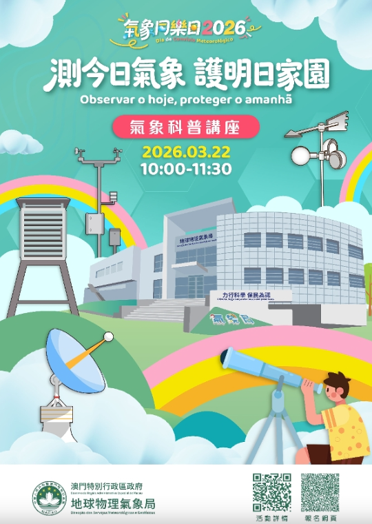 為慶祝3月23日“世界氣象日”及加深公眾對氣象科普知識的瞭解,地球物理氣象局將舉辦面向全澳居民的“氣象同樂日”活動,以及面向年滿十歲或以上之本澳居民的“測今日氣象,護明日家園”氣象科普講座及參觀活動。兩項活動皆由即日(4日)起至3月9日透過一戶通的“活動報名”欄目報名,參加者於活動結束後可領取精美紀念品乙份。歡迎市民踴躍參加,一同體驗氣象科學的樂趣。