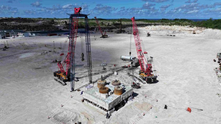 在瑙魯梅能區,瑙魯體育中心項目春節期間正常組織施工作業,進行樁基礎試樁施工及檢測工作。中交四航局建設者通過開展單樁豎向抗壓靜載試驗,現場搭建壓重平臺反力裝置,運用全自動靜載測試系統嚴格執行“慢速維持荷載法”,試驗最大荷載達637噸,並採用全程自動化監測樁頂沉降數據,獲取地基持力層真實的承載性能回饋。該節點工作的順利實施,有效驗證了樁基設計參數,為節後大規模工程樁施工提供了實體數據依據。
