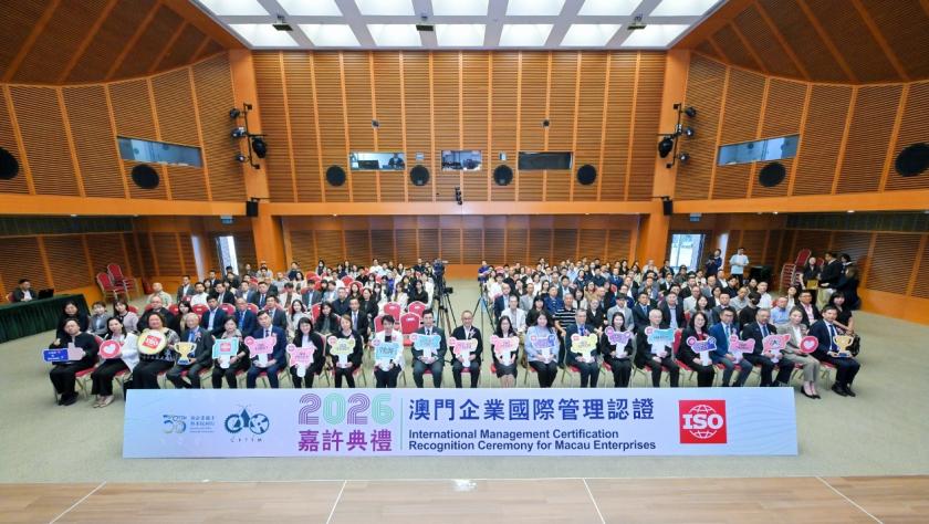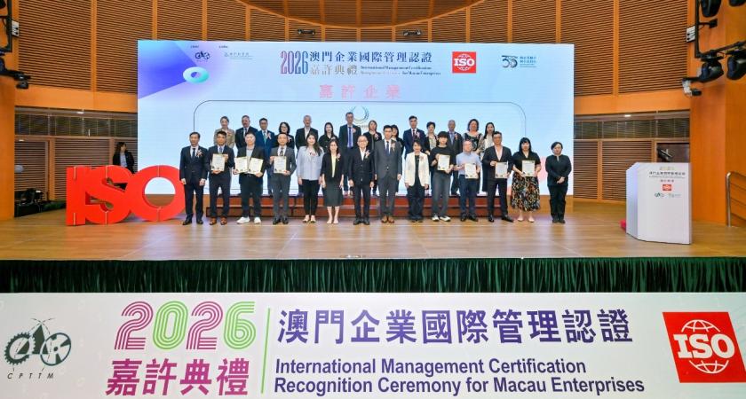 澳門生產力暨科技轉移中心(下稱“生產力中心")於4月2日假澳門科學館舉行“2026澳門企業國際管理認證嘉許典禮”,表彰共134家持續持有國際認證的本澳企業。典禮依企業連續持證年資頒發金獎、銀獎及銅獎,並特別增設“綜合管理成就獎”,以嘉許模範企業。