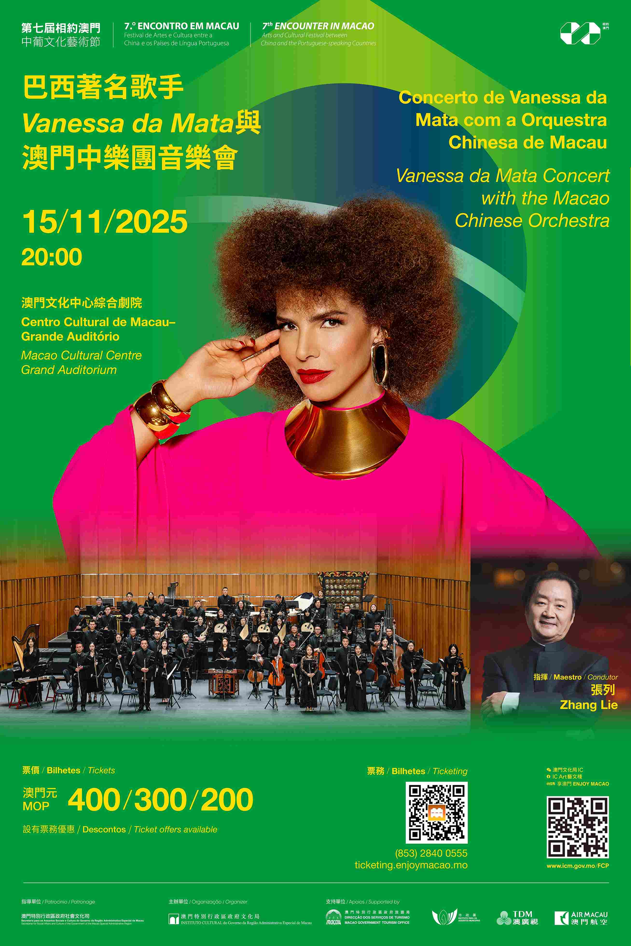 第七屆“相約澳門——中葡文化藝術節”之《巴西著名歌手Vanessa da Mata與澳門中樂團音樂會》,將於11月15日晚上8時在澳門文化中心綜合劇院上演。門票自10月28日早上10時起在“享澳門售票網”公開發售。Vanessa da Mata為巴西當代樂壇具影響力的歌手及作曲家,以多才多藝的藝術表現與富感染力的作品聞名,並憑藉獨具韻味的嗓音與令人難忘的創作吸引各地樂迷,成為巴西音樂的代表人物之一...
