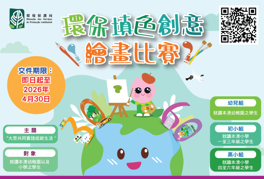 2026年六五環境日國家主場活動暨美麗中國宣傳週將在國家生態環境部指導下,由粵港澳三地聯合舉辦。環境保護局將舉辦2026年六五環境日國家主場活動暨美麗中國宣傳週(澳門區)之子項目的系列活動。其中,“環保填色創意繪畫比賽”為是次系列活動之一,比賽 以《澳門長期減碳策略》之“大眾共同實踐低碳生活"為主題,並配合國家實現“雙碳”目標,提升兒童的環保減碳意識,鼓勵齊來參與乾淨回收,以及在日常生活中實踐各類...