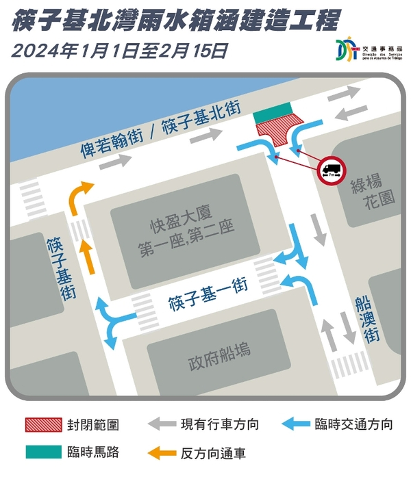 市政署正有序推展筷子基北灣泵站箱涵渠工程,在接續的階段,即由12月16日起,俾若翰街與船澳街交界,以及林茂海邊大馬路與船澳街交界將會同步施工,屆時相關路段將實施多項臨時交通措施,交通事務局亦於沙梨頭南街新增臨時掉頭車行道,以更好地疏導周邊道路的車流,有關臨時交通安排可參閱附表。
