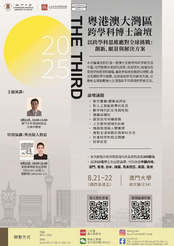 為促進粵港澳大灣區的學術交流發展,打造一個探討全球議題的跨學科對話平台,澳門大學人文社科高等研究院將於8月21至22日舉辦“第三屆粵港澳大灣區跨學科博士論壇”。超過60位來自全球的博士生以及專家學者將圍繞主題“以跨學科思維應對全球挑戰:創新、願景與解決方案”,共同探索創新性的解決方案,以應對全球挑戰。歡迎有興趣人士參加。