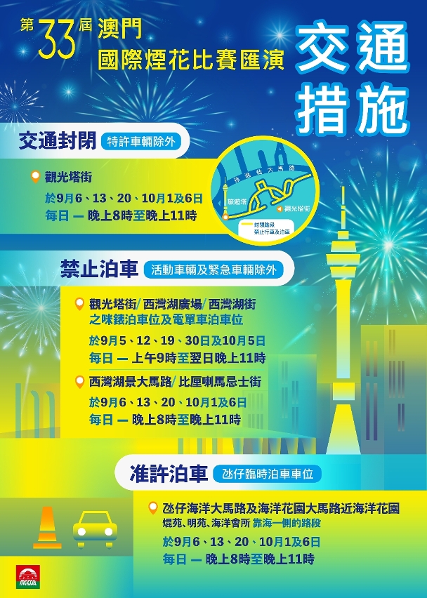 活動期間周邊道路將實施臨時管制,涵蓋觀光塔街、西灣湖廣場、西灣湖街的咪錶泊車位及電單車泊車位、西灣湖景大馬路、比厘喇馬忌士街、氹仔海洋大馬路及海洋花園大馬路近海洋花園,敬請公眾留意相關安排。