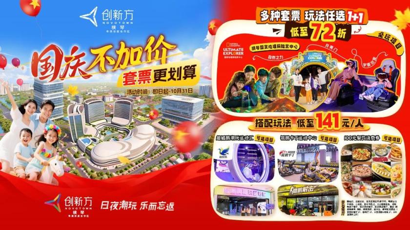 今年國慶黃金周去哪玩?橫琴創新方為你準備了驚喜福利和豐富活動!2025年國慶期間,橫琴創新方以“熊貓秘境探險”為主題,推出多項早鳥及套票優惠,涵蓋樂園、運動、餐飲等多重體驗,優惠低至72折,不僅“國慶不加價,並且提前購更划算!更值得一提的是,創新方作為大灣區一站式全室內文旅綜合體,不怕日曬雨淋,交通便利,距離橫琴口岸僅10分鐘車程,經港珠澳大橋約90分鐘就能到達香港,國慶無論是想在一個城市慢慢玩,還是計畫“珠港澳”一程多站聯遊都十分便利。非常適合親子家庭和年輕遊客一站式“深度玩+輕鬆逛”。