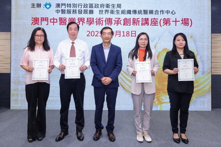 衛生局中醫服務發展廳和世界衛生組織傳統醫藥合作中心(澳門)日前共同舉辦第10場“澳門中醫業界學術傳承創新講座”,邀請龔棟森、張用愛、何展雲和蔡通4位具豐富經驗的本地中醫作為主講嘉賓,與中醫業界交流從業心得和分享臨床經驗。衛生局鄭成業副局長和世界衛生組織傳統醫藥合作中心(澳門)莫蕙主任出席並主持活動。