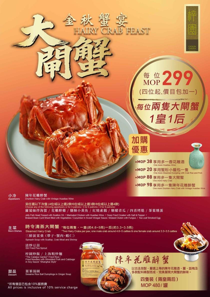 秋意漸濃,正是品味大閘蟹的黃金季節。澳門皇都酒店梓園上海菜館誠意推出兩款大閘蟹主題盛宴—「大閘蟹至尊金蟹宴」及「大閘蟹時令臻味套餐」,以頂級江蘇大閘蟹為主角,配以多款匠心烹製的蟹饌美饌,引領食客展開一場極致鮮美的味覺之旅。各位賓客除可享用兩隻正宗江蘇大閘蟹(一皇一后)外,更可品嘗多款以新鮮蟹肉及蟹膏匠心烹製的珍饈美饌,包括陳年花雕醉大閘蟹、蛋白蟹黃翅、蟹粉炒蝦仁、蟹粉扒豆苗及香焗蟹粉酥餅。每道佳餚皆由主廚精心設計,將大閘蟹的鮮美發揮得淋漓盡致,令人回味無窮。鍾愛大閘蟹的饕客們,是時候展開今秋的味覺盛宴了!