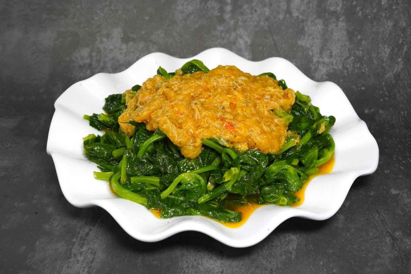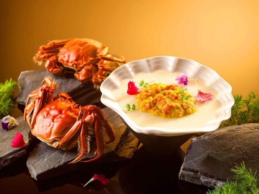 「大閘蟹至尊金蟹宴」則專為追求極致體驗的食客而設。除了清蒸大閘蟹和陳年花雕醉蟹,更囊括蛋白蟹黃翅、蟹粉炒蝦仁、蟹粉扒豆苗及香焗蟹粉酥餅等經典蟹粉菜式,盡顯宴席氣派與廚藝功力。