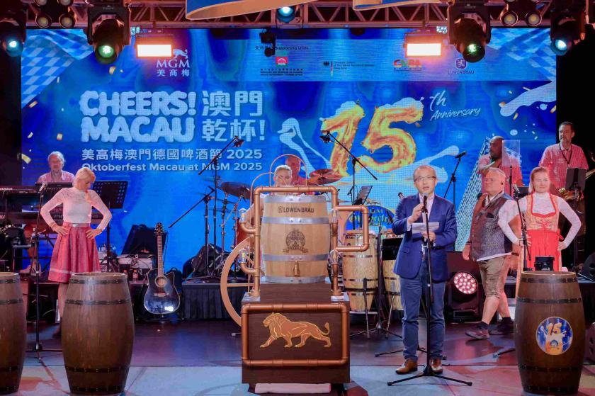美高梅中國控股有限公司總裁及執行董事馮小峰於開幕典禮敲開第一桶啤酒,象徵本屆啤酒節正式開鑼。他表示:「啤酒節的意義不止於歡聚,更在於凝聚,正是這份凝聚力,讓它十五載不斷延續,成為大家每年期待的、充滿歡笑與回憶的派對。今年活動更將迎來第20萬位賓客,這不僅是里程碑,更體現美高梅長期深耕澳門文旅領域的成果。我們期望透過這個活動,實現『美食、旅遊、文化、節慶和娛樂』五者交織的聯動效應,持續為澳門注入活力。」