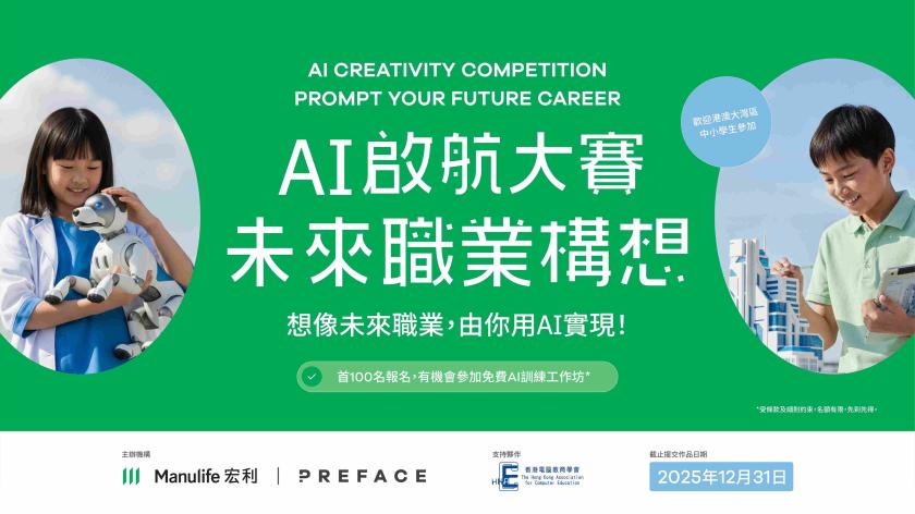 人工智能正迅速成為推動社會發展的核心動力,年輕一代的創意與創科思維將是塑造未來世界的重要基石。為啟發學生對未來的想像,同時鼓勵家長與子女共學探索,宏利香港聯同科技教育機構 Preface於九月起推出「未來啟航增值體驗」,繼「Back-to-School:AI體驗日」及「未來啟航工作坊」系列後,再次聯手舉辦「AI啟航大賽﹕未來職業構想 」,鼓勵港、澳及大灣區內地城市6至18歲的中小學生運用AI技術,探索未來職涯的多元可能,並為迎接未來做好準備。