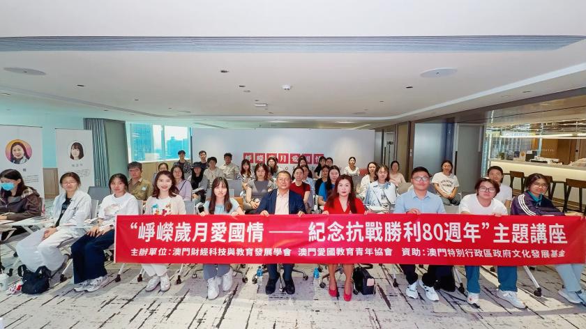 由澳門財經科技與教育發展學會、澳門愛國教育青年協會聯合主辦,並獲澳門文化發展基金資助的“崢嶸歲月愛國情——紀念抗戰勝利80週年”主題講座,8日下午在澳門青年孵化中心會議廳隆重舉行。活動旨在透過重溫歷史、感悟精神,激發當代澳門青年愛國情懷,傳承發揚抗戰精神。
