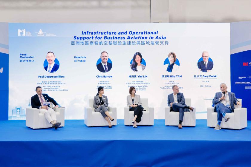 首場研討由AsBAA副主席Paul Desgrosseilliers主持,聚焦「亞洲地區商務航空基礎設施建設與區域運營支持」,香港商用航空中心、亞環(北京)航空信息諮詢有限公司、TAG航空-澳門等機構代表參與討論,共同剖析區域發展的遇與挑戰。
