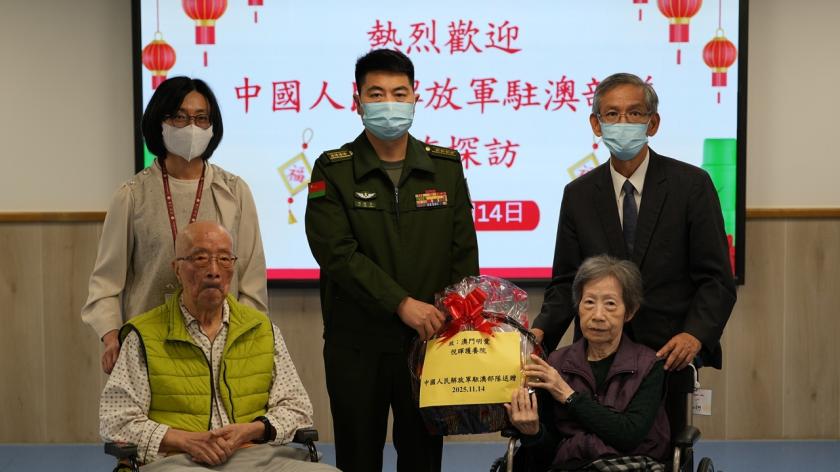 為感謝長者對本澳社會的貢獻,弘揚敬老崇孝的社會價值,中國人民解放軍駐澳門部隊政治工作部副主任劉陳長與官兵代表,在澳門特別行政區政府社會工作局局長韓衛的陪同下,於11月14日下午到訪澳門明愛屬下的悅暉護養院探訪及關懷長者。