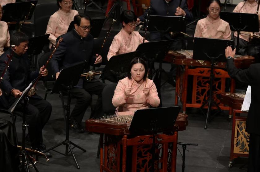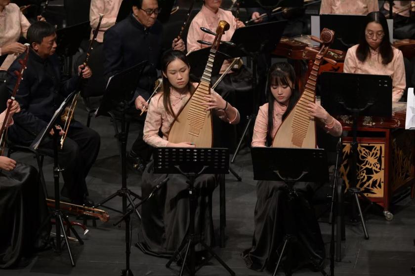 古箏協奏曲《漁舟唱晚主題隨想曲》由古箏首席葉樂怡獨奏,她以嫺熟指法與細膩呼吸,在經典主題上拓展出個人風格,勾勒出水鄉意境,兼具敘事性與畫面感。揚琴協奏曲《憶事曲》由揚琴首席張燕儀領奏,作品曾斬獲全國民族器樂比賽獎項,演繹中體現揚琴「清脆透亮、顆粒分明」的音色特質,旋律綿長、情感克制。琵琶協奏曲《春江花月夜》由梁敏儀與林沁怡聯合領奏,二人師承名家,以默契對答與富有韻味的指法,在民族管弦襯托下,將「月夜春江」的朦朧與詩意演繹得極具感染力,成為全場高光之一。