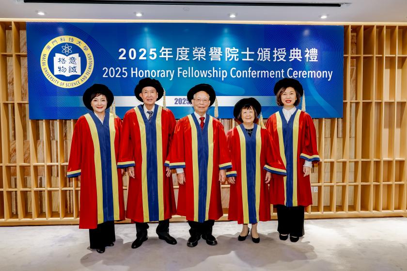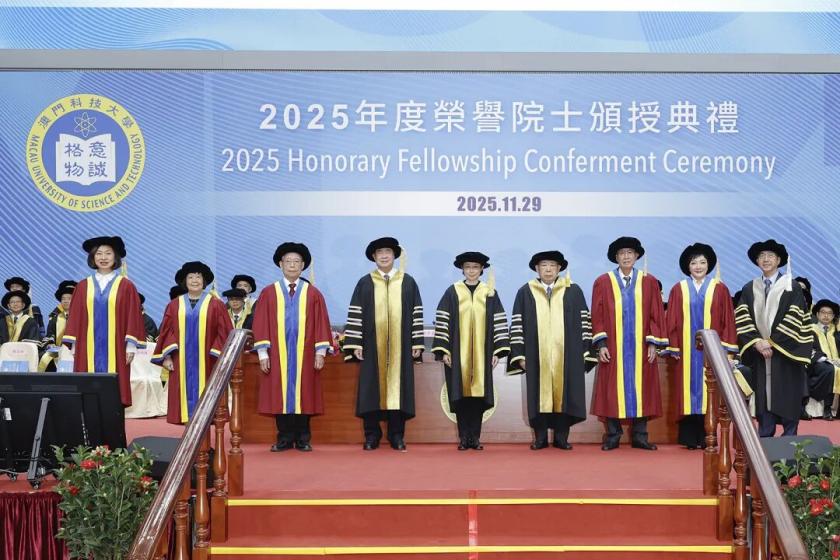 11月29日下午,澳門科技大學2025年度榮譽院士頒授典禮於大學R座綜合教學大樓綜藝廳圓滿舉行。典禮同步在線上直播進行。頒授榮譽院士名銜旨在表彰對社會及大學發展有重大貢獻的傑出人士。為表彰其在經濟、文化、教育、醫療等領域的卓越成就,澳科大特將此榮譽授予以下五位傑出人士:吳仕明、馬有恆、吳培娟、蘇香玫、陳志玲。