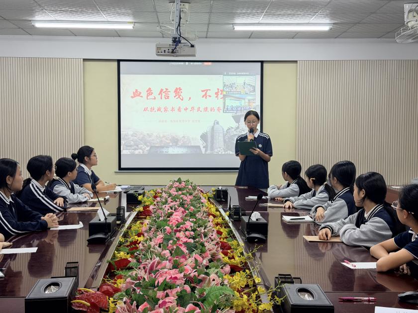 活動於日前舉行,培華中學王帆主任、學生會指導教師林尓豪、區慧欣,夏灣中學團委書記紀曼純、黨務幹事龍海峰等師生代表共同參與。活動流程緊湊而富有層次:培華中學初三丙班李晴昕同學首先分享了其高齡外婆在抗戰期間的親身經歷,那段躲避日軍、饑寒交迫的往事,讓和平年代的學子真切感受到戰爭的殘酷與和平的可貴。隨後,夏灣中學初三11班冶雪蓮同學以《血色信箋,不朽豐碑》為題,深情誦讀並剖析抗戰家書中蘊含的犧牲、擔當與大愛,從飛行員陳懷民的絕筆到左權將軍的未寄家書,一字一句,皆是民族精神的血淚鑄造。