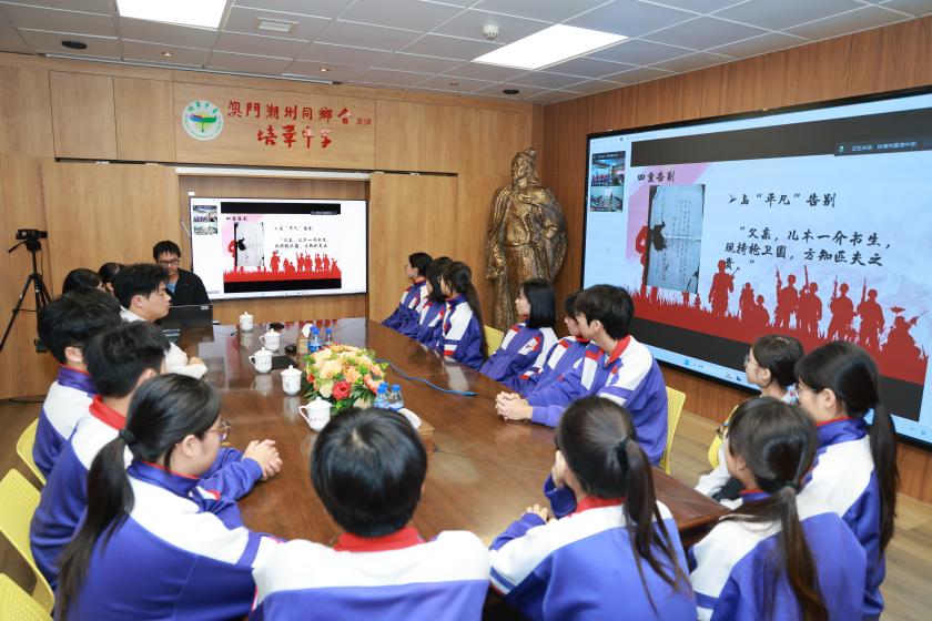 在抗日戰爭勝利80週年之際,澳門培華中學與珠海夏灣中學攜手舉辦了一場深沉而莊重的國家公祭日紀念活動。兩校師生透過線上連線,共同回望那段烽火連天的歲月,聆聽歷史的回響,感受民族脊樑的鏗鏘力量。