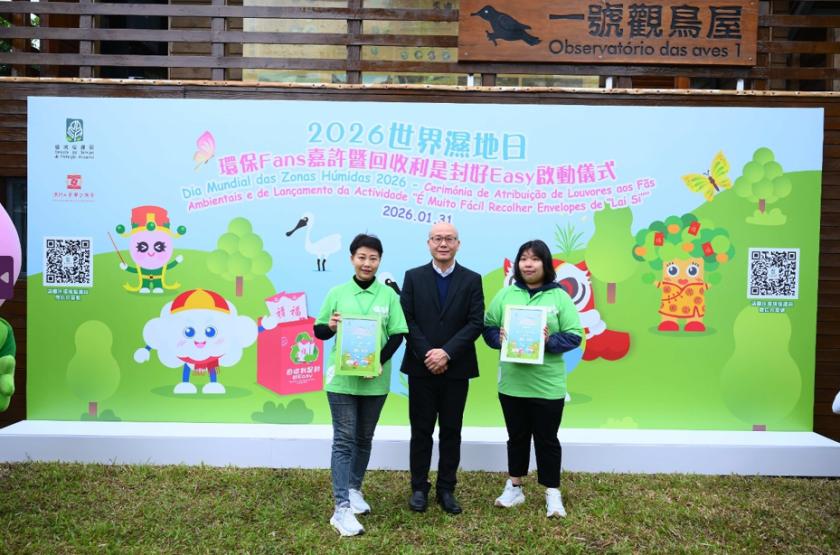為配合國家實現“雙碳”目標以及響應2月2日的世界濕地日,環境保護局於2026年1月31日在路氹城生態保護區舉行“2026世界濕地日—環保Fans嘉許暨回收利是封好Easy啟動儀式”,帶動社會各界積極實踐各種環保減碳行為。