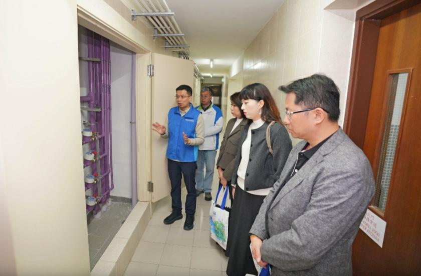 委員們首先參觀了石排灣樂群樓休憩區的“再生水資訊站”,了解宣傳資訊內容以及專員駐站講解服務,並參觀樂群樓的雙管道供水系統、水錶房及屋內供水設施。隨後前往路環再生水站一期,了解再生水站一期的規劃、日常運作、供水能力及應急預案等。