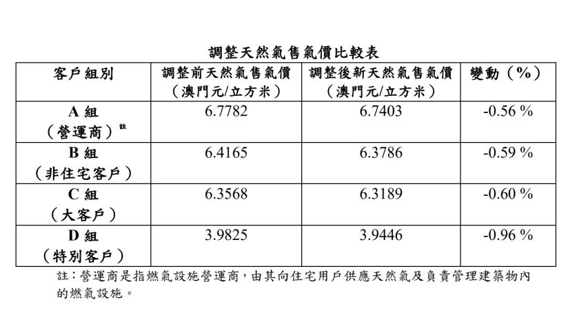 因應近年國際天然氣價格有所下調,以及按人民幣兌澳門元匯率的變動,供澳天然氣的採購成本因而降低。因此,特區政府根據《天然氣批發供應公共服務公證合同》附件四第二條第七款的規定,透過第42/2026號行政長官批示對天然氣售氣價格作相應調整,並由即日起實施。四個客戶組別的天然氣售氣價格分別下調約0.6%至1%。