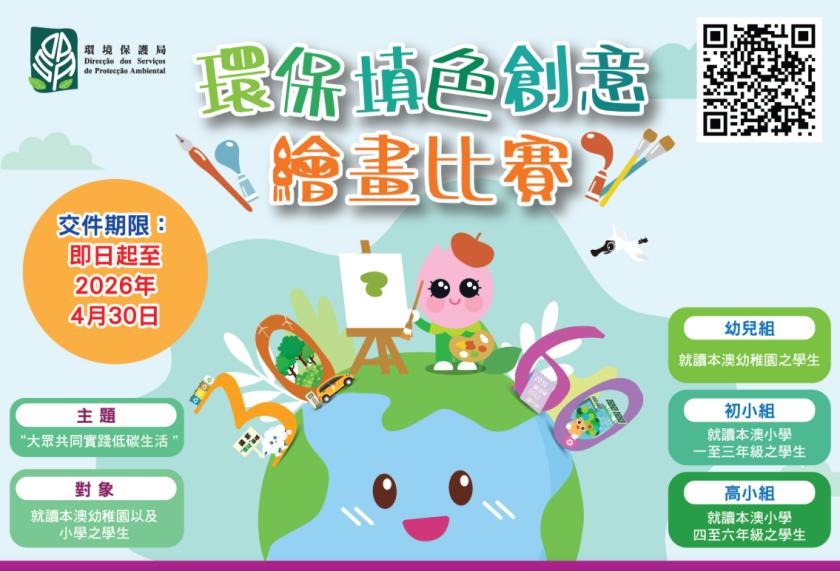 “環保填色創意繪畫比賽”分為幼兒組、初小組以及高小組,每組將分別設有冠、亞、季軍及校園優秀表現獎等獎項,作品可於2026年4月1日至30日遞交至環境保護局。比賽詳情可瀏覽環境保護局網頁(www.dspa.gov.mo/drawingcompetition)或致電“環保熱線”(2876 2626)查詢。