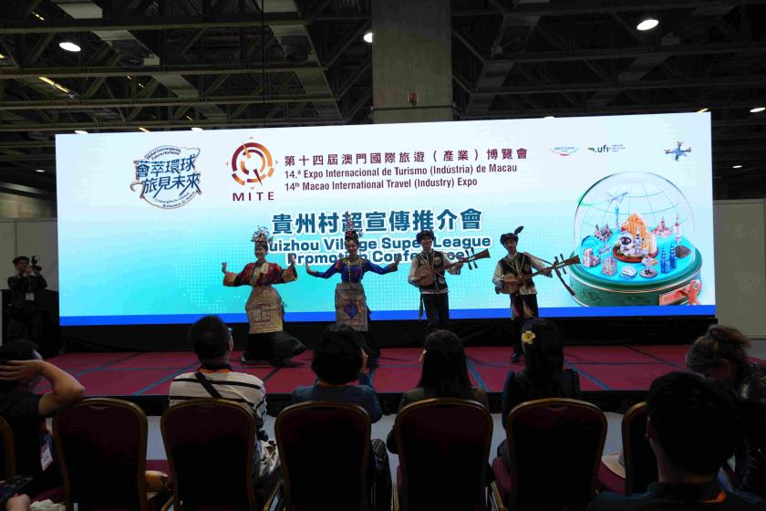 4月11日,貴州榕江“村超”參展團亮相澳門威尼斯人金光會展展館,通過民族展演、文旅推介、招商洽談、互動體驗等多種形式,將濃郁苗侗風情與鄉村體育活力帶到濠江之畔,讓大山深處的文旅魅力驚豔澳門,架起黔澳兩地文旅互通、民心相通的堅實橋樑。