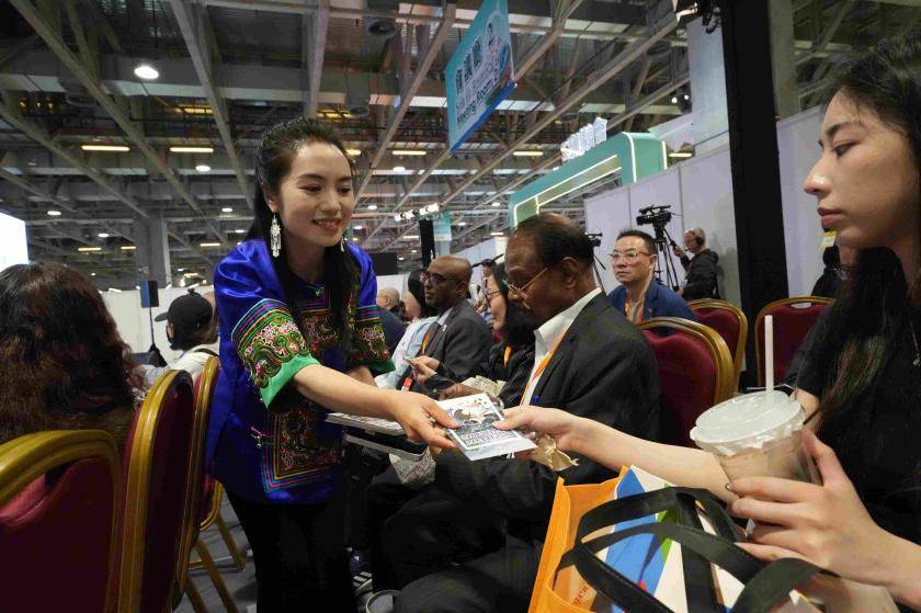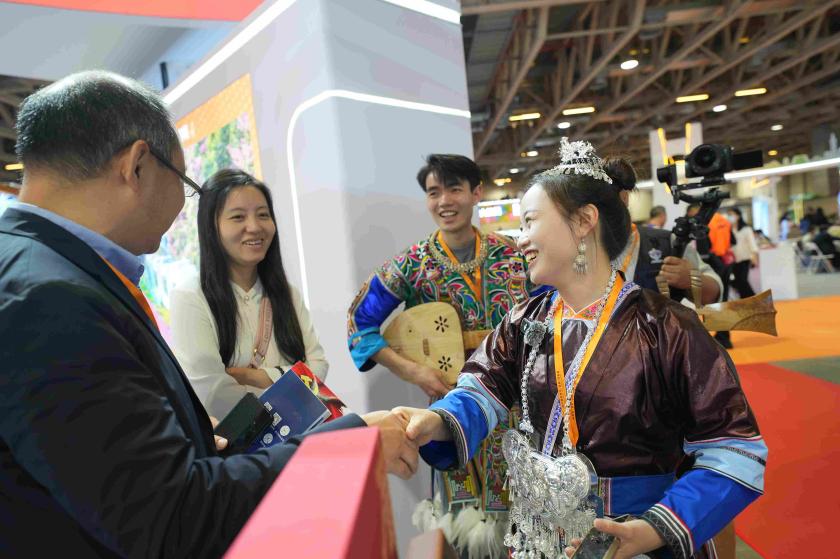 展館推介會現場,黔東南民族風情濃郁熱烈。身著精美苗侗盛裝的表演者輪番登臺,婉轉空靈的侗族琵琶歌、高亢激昂的蘆笙樂輪番上演,生動展現苗鄉侗寨的淳樸熱情與人文底蘊。連日來,非遺展演持續吸引澳門市民與各地客商駐足觀賞、互動交流,掌聲不斷、氛圍熱烈,成為展會現場人氣十足的文化亮點。