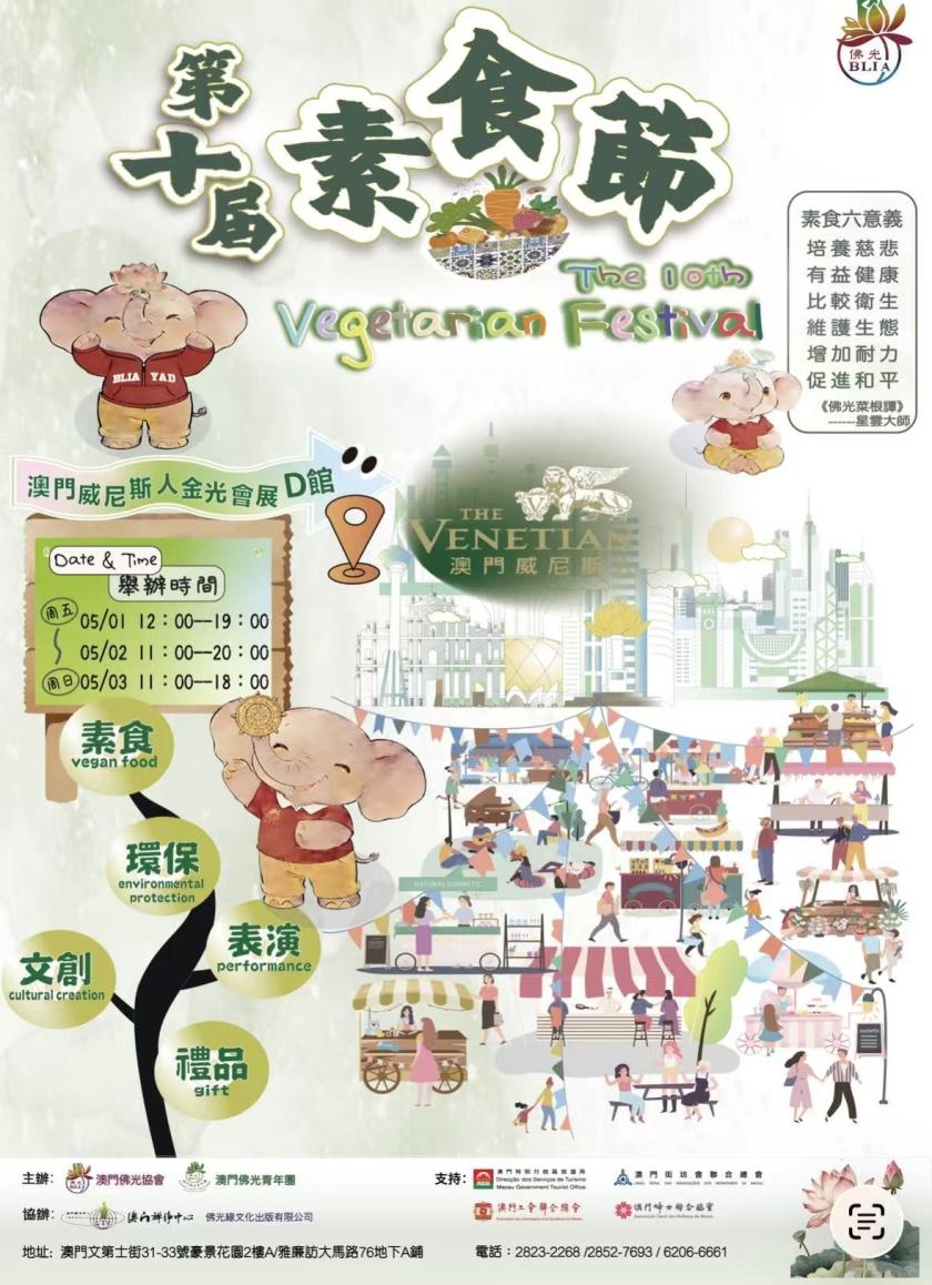 由澳門佛光協會、澳門佛光青年團主辦的“第十屆素食節”,將於5月1日至3日,假威尼斯人金光會展展館D閃亮登場,匯聚近一百二十個攤位,在五一黃金週假期期間,為旅客與全澳市民提供一個好吃、好玩、靜心、休閒的好去處。