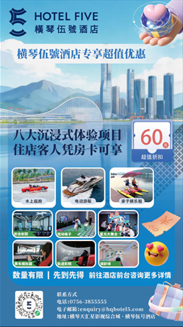 橫琴伍號酒店宣布將聯乘澳門售票網及多個橫琴本地 品牌推出「澳琴聯遊」套票,為旅客提供一站式跨境休閒體驗。作為大灣區首間 以賽事選手及觀演粉絲群體為核心客群的「賽演友好型酒店」,酒店自今年2月 試業以來,持續深化橫琴與澳門之間的文體旅協同,推動澳琴文體旅高質量融合 發展。