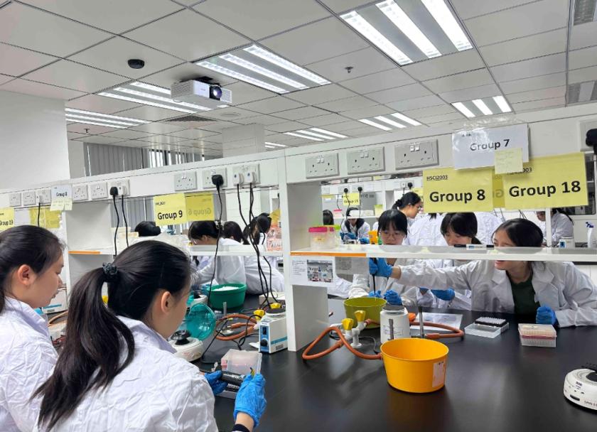 活動期間,學員分組輪流參與三項精心設計的科研體驗實驗,內容涵蓋分子生物學、藥物科學、生物信息學等多個前沿領域。在質粒酶切及電泳實驗中,學員運用限制性內切酶對DNA樣本進行處理,並透過凝膠電泳比較未切割、單酶切及雙酶切樣本,加深對基因結構及分子操作原理的理解;在熊果苷乳霜製備實驗中,學員從原料配比到乳霜調製,全程動手操作,從中認識藥物與功能性護膚產品研發背後的科學基礎;而在生物信息學實驗中,學員則透過數據分析與分子演化方法,了解基因體學、測序技術及其在精準醫學、藥物開發和演化研究中的應用,了解跨學科研究在現代生命科學中的重要角色。